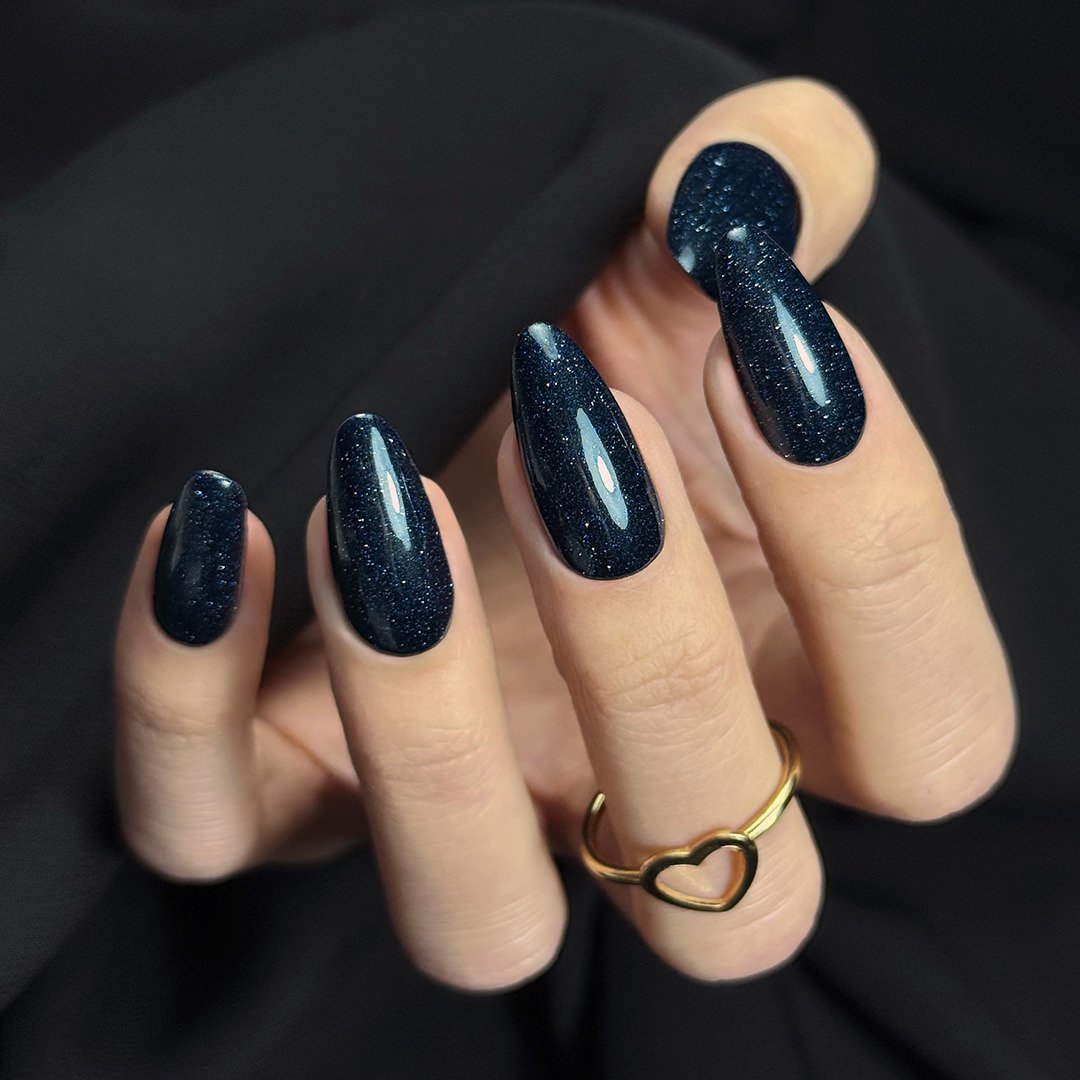 595 Cairo Night van Slowianka Nail Trends is een diepe, marineblauwe tint geïnspireerd op de nachtelijke hemel, verrijkt met fonkelende deeltjes met een koele glans. De kleur creëert een verlicht diepte-effect dat subtiel verandert afhankelijk van het licht.