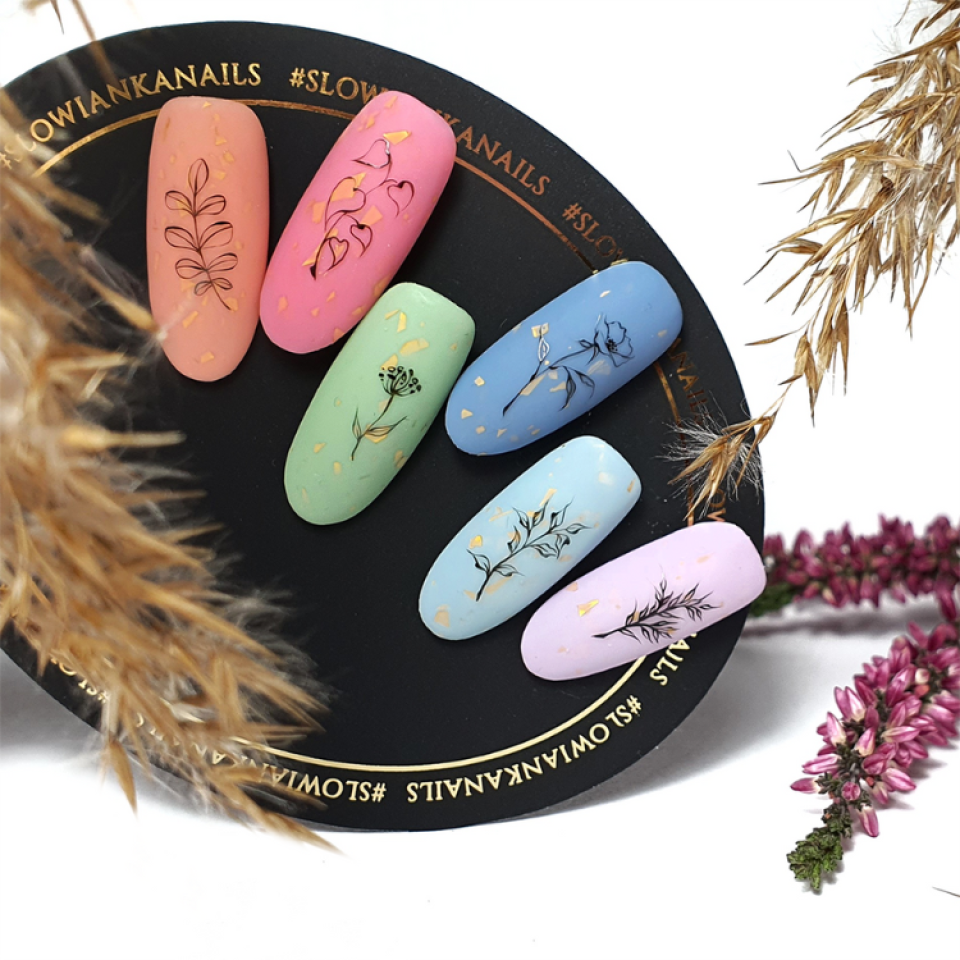De Petals Alchemy Collection is de nieuwe herfst collectie van Slowianka Nail Trends. Ook dit keer worden we verrast door deze mooie collectie. 6 prachtige kleuren met goude foliedeeltjes, deze zijn middelgroot zodat u ze voorzichtig kan schikken tijdens het aanbrengen. De dekkingsgraad van deze collectie is 80%, dit is zo omdat de goudvlokken mooi zichtbaar en glanzend moeten zijn.
