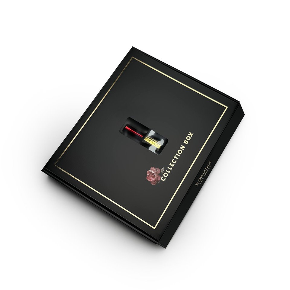 De doos bevat 5 gellakken, Top No wipe, staaltjes om te lakken en te plakken op een gepersonaliseerde folder voor uw verzameling. Deze is ook bij de doos inbegrepen.